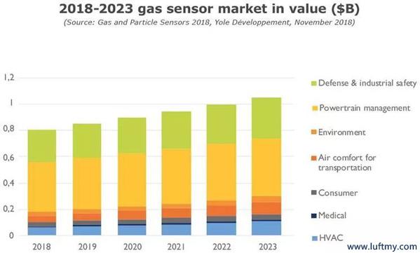而現(xiàn)在,我們觀察到:由于居民需要清潔的室內(nèi)空氣,氣體傳感器的主要職能從“舒適”轉(zhuǎn)變?yōu)?ldquo;安全”。該趨勢(shì)還延伸至其它環(huán)境,如私家車和公共交通工具,從而促使氣體傳感器應(yīng)用系統(tǒng)市場(chǎng)不斷增長(zhǎng),例如通常集成氣體和顆粒物傳感器的空氣凈化器市場(chǎng)預(yù)計(jì)將從2017年的160億美元增至2023年的330億美元,復(fù)合年增長(zhǎng)率(CAGR)為12.5%。商用車越來(lái)越多地安裝氣體和顆粒物傳感器,以確保為乘客提供高品質(zhì)的空氣。以前的應(yīng)用場(chǎng)景是:車內(nèi)傳感器檢測(cè)到二氧化碳(CO2)和揮發(fā)性有機(jī)化合物(VOC)濃度變高時(shí),就會(huì)激活空調(diào)系統(tǒng)。